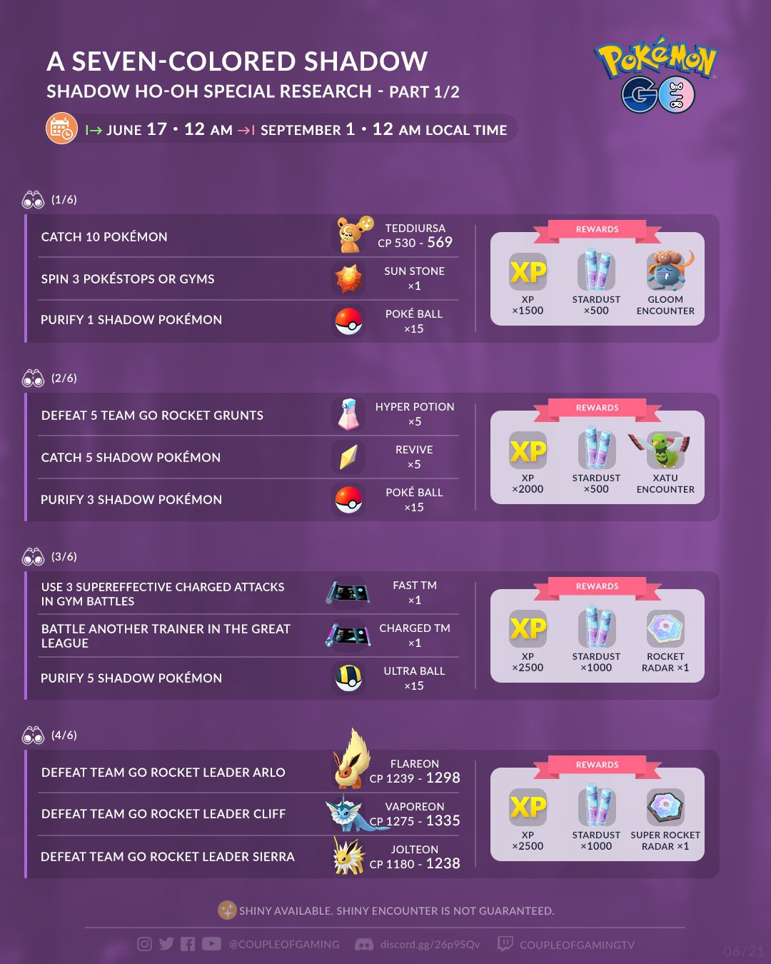 Each activity within the newest GO Rocket Analysis The newest spherical of Pokemon GO Rocket Particular Analysis goes reside June 17 and provides you an opportunity at acquiring and purifying a Shadow Ho-Oh amongst different issues. A Seven-Coloured Shadow is offered from from June 17 2021 to September 1 2021 and Giovanni will management a. In Pokemon Go A Seven Coloured Shadow is all about catching a Shadow Legendary Pokemon.